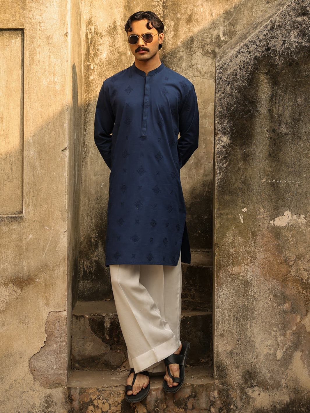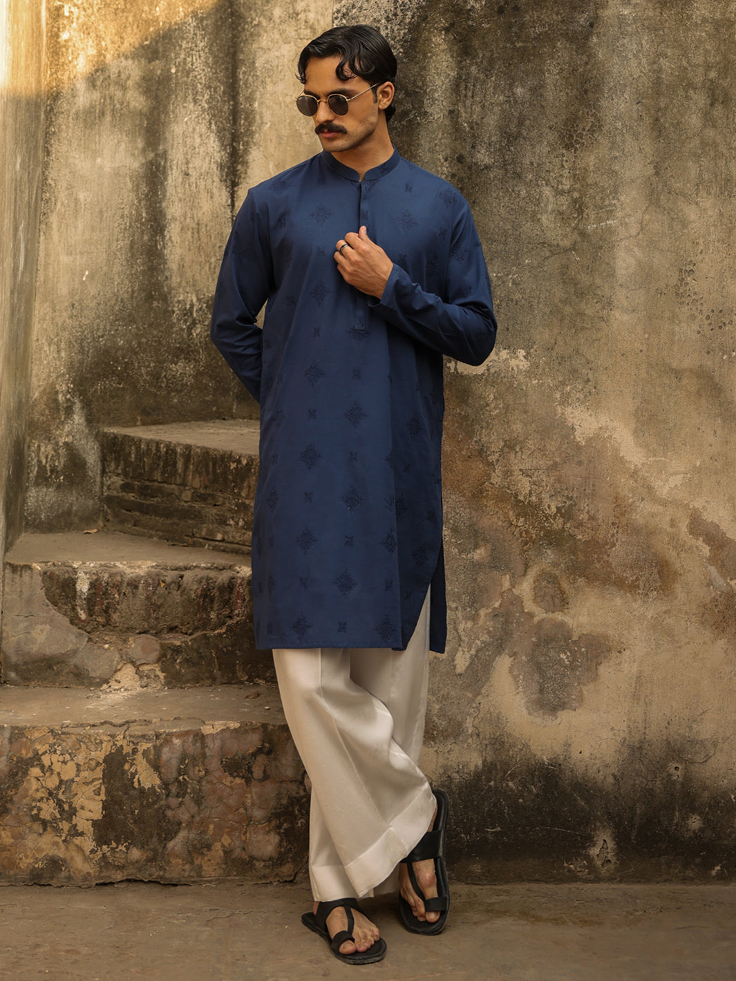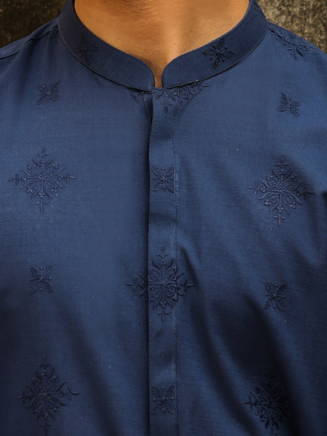 Full Embroidered Blue Kurta With Invisible Placket