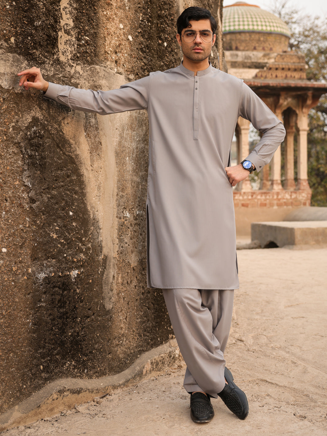 Light Grey Kameez Shalwar With Cut And Sew Details On Collar And Placket