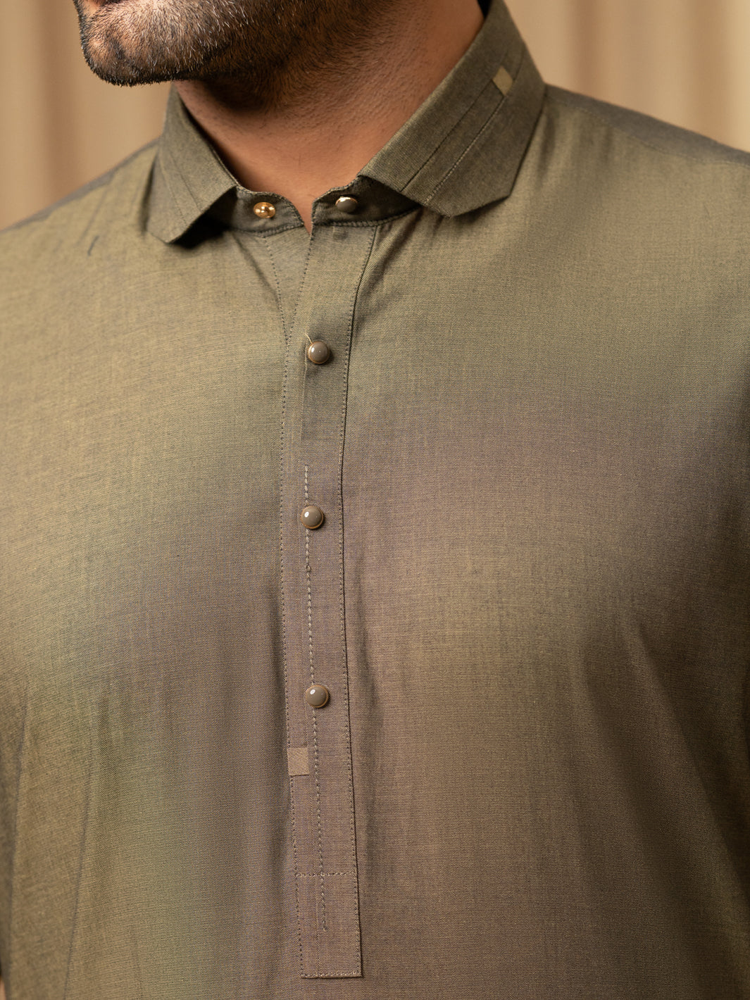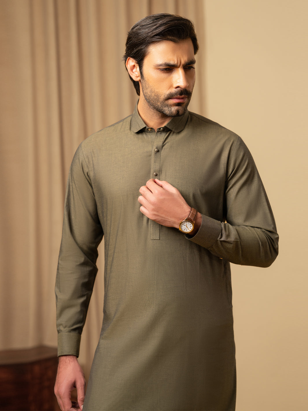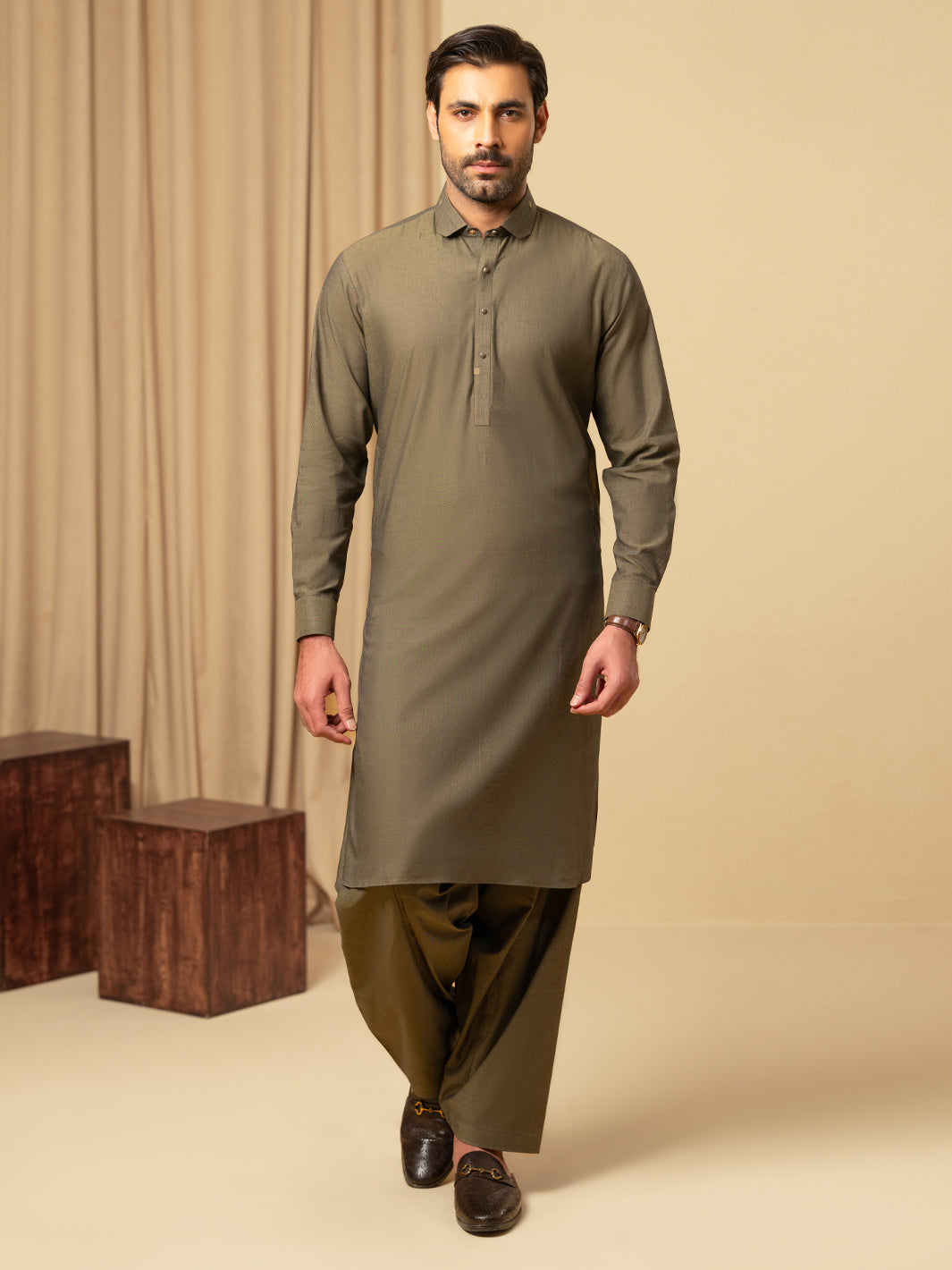Olive Green Kameez Shalwar With Stylized Collar and Details on Placket and Cuffs