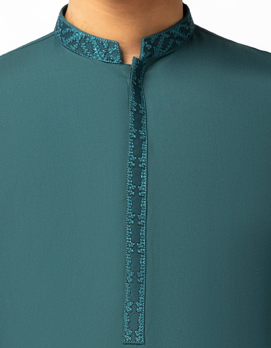 This semi-formal suit showcases delicate embroidery on the collar and placket, offering a perfect blend of traditional charm and contemporary style. Ideal for festive events, family gatherings, or special occasions.