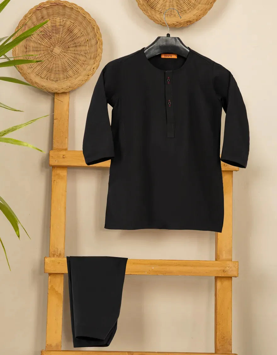 Made for comfort and ease, this black plain kameez shalwar features soft stitching and a gentle design touch. The subtle patterns and button details add a graceful look without causing any fuss. Ideal for little ones who need free movement with a neat appearance.