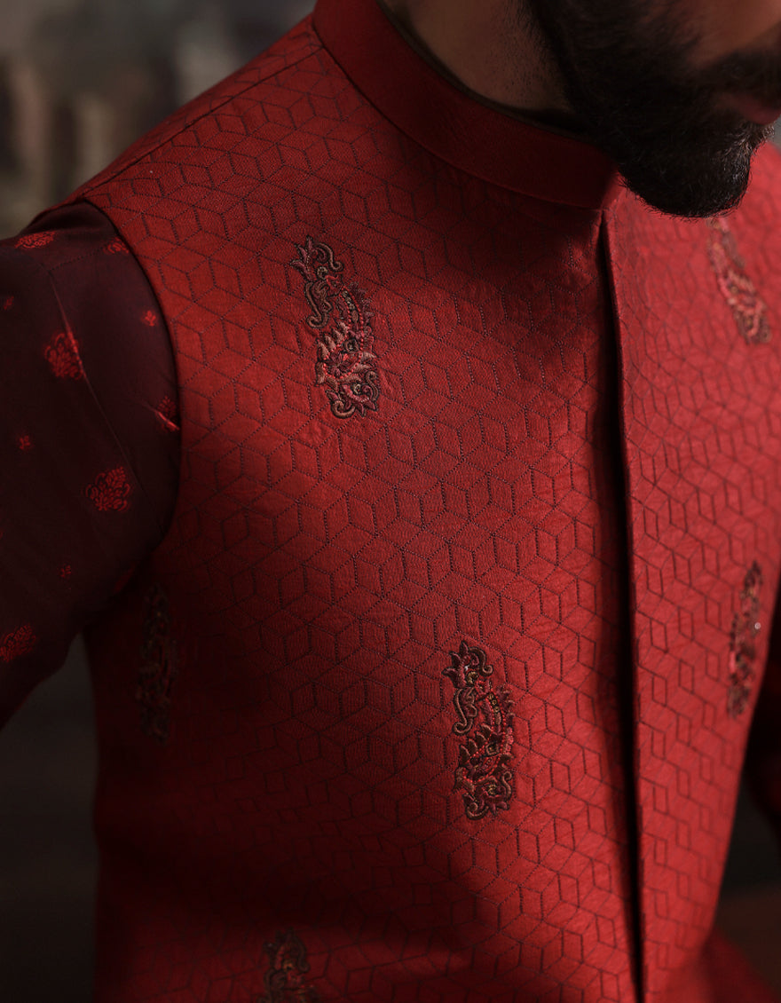 Red 3pc men's suit, heavy embroided waistcoat with self-jacquard kurta and plain trousers.