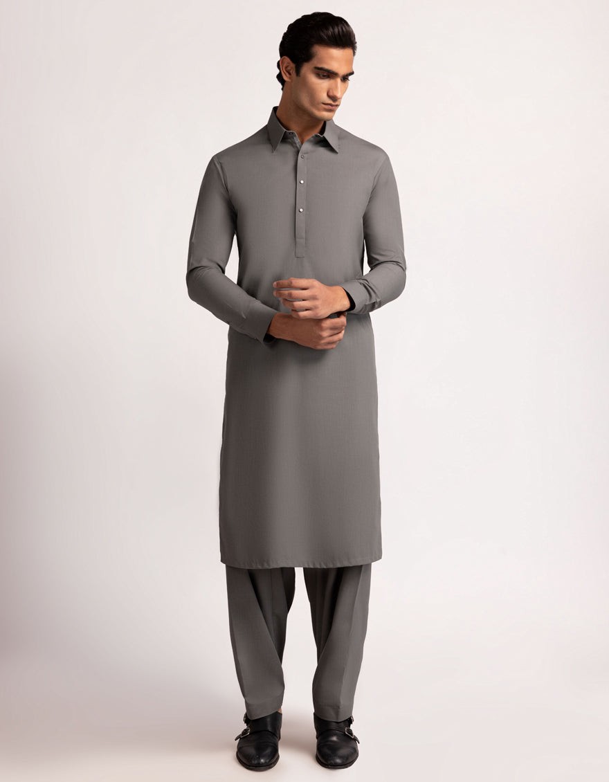 A classic eastern wear set designed with clean stitching and thoughtful detailing. The grey casual kameez shalwar offers a neat look & comfortable fit - ideal for long wear, daily use, or special occasions with a touch of tradition.