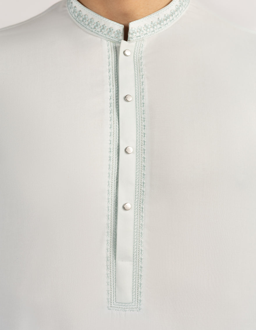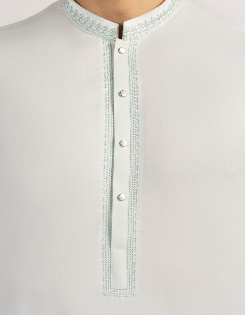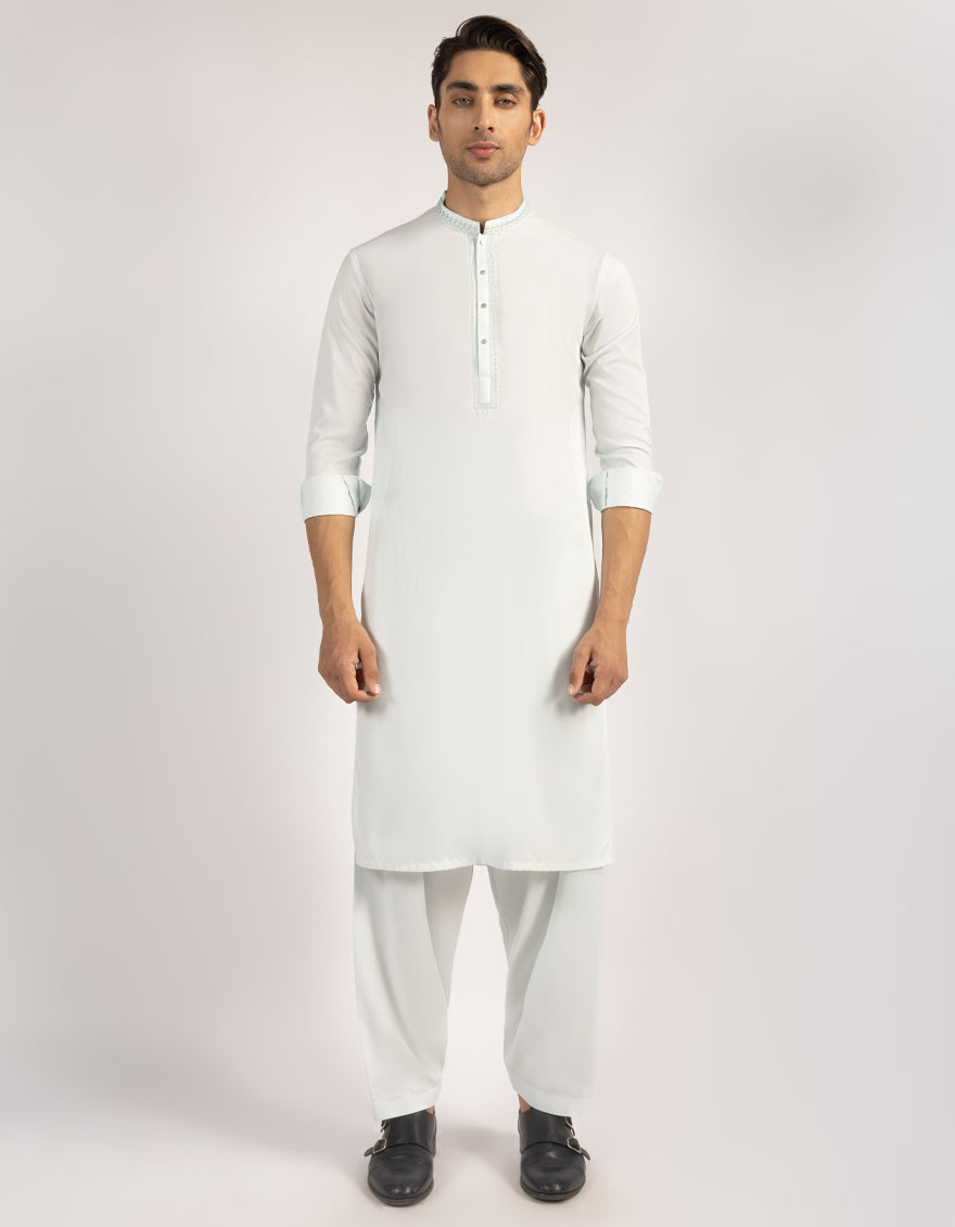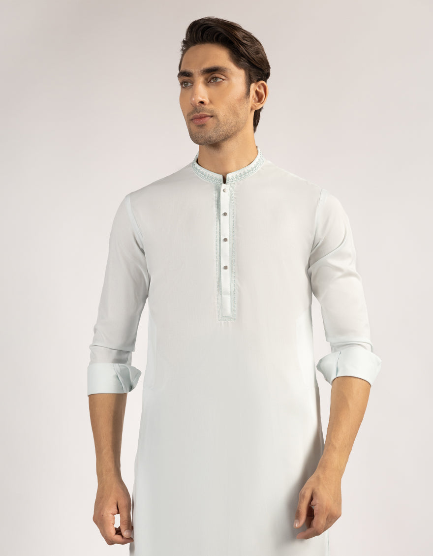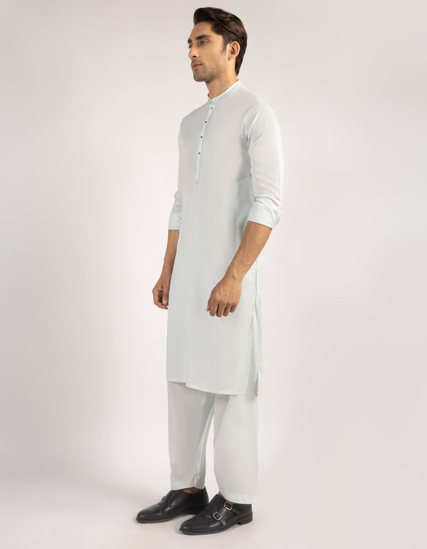 A classic eastern wear set designed with clean stitching and thoughtful detailing. The Powder Green Blended Semi-Formal Kameez Shalwar offers a neat look & comfortable fit - ideal for long wear, daily use, or special occasions with a touch of tradition.
