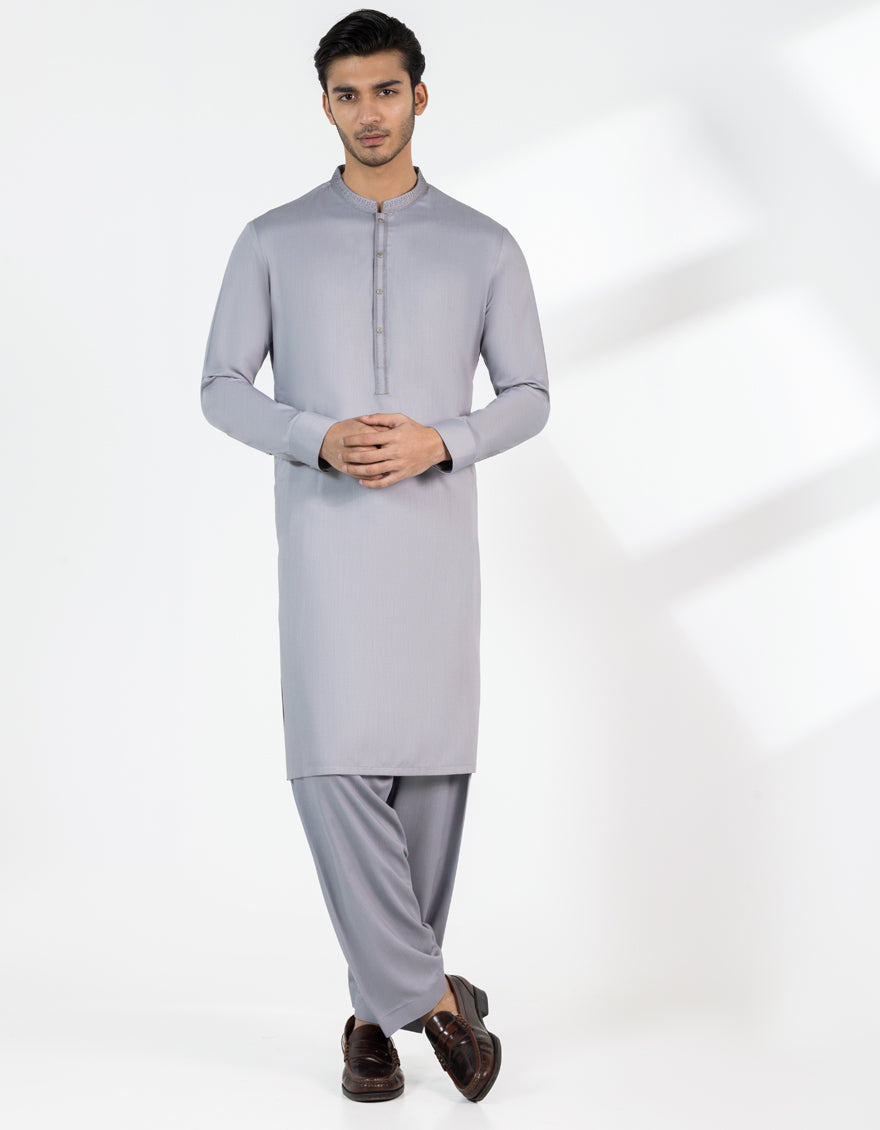 This light grey blended semi-formal kameez shalwar offers a neat, stylish look that works well for family gatherings, dinners, or casual events. Easy to wear and effortlessly smart.