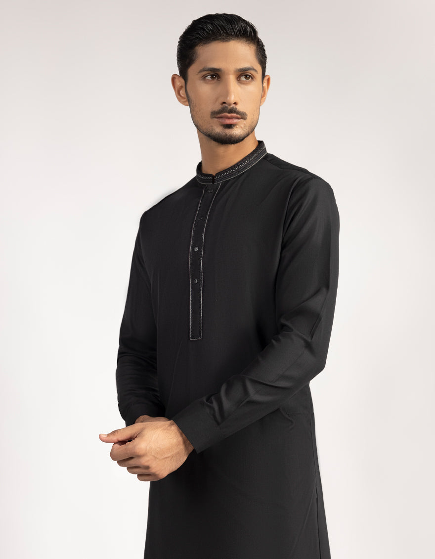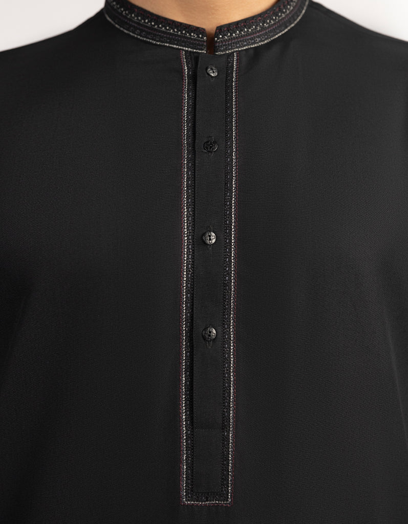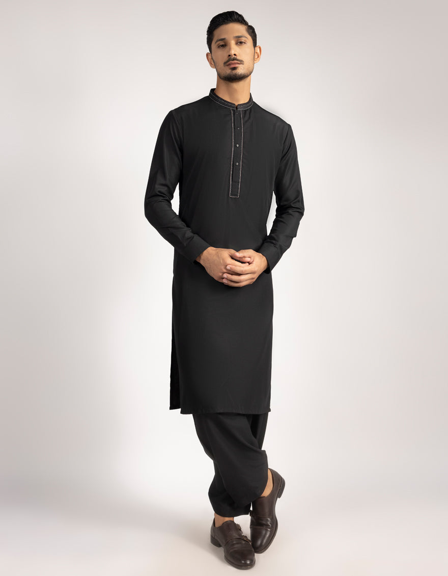 A classic eastern wear set designed with clean stitching and thoughtful detailing. The Black Blended Semi-Formal Kameez Shalwar offers a neat look & comfortable fit - ideal for long wear, daily use, or special occasions with a touch of tradition.