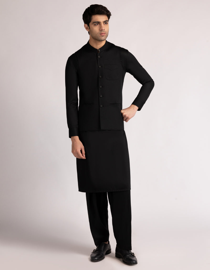 BLACK BLENDED KAMEEZ SHALWAR & WAISTCOAT | JJKSVC-W-47544/S25/JJ10084-PN