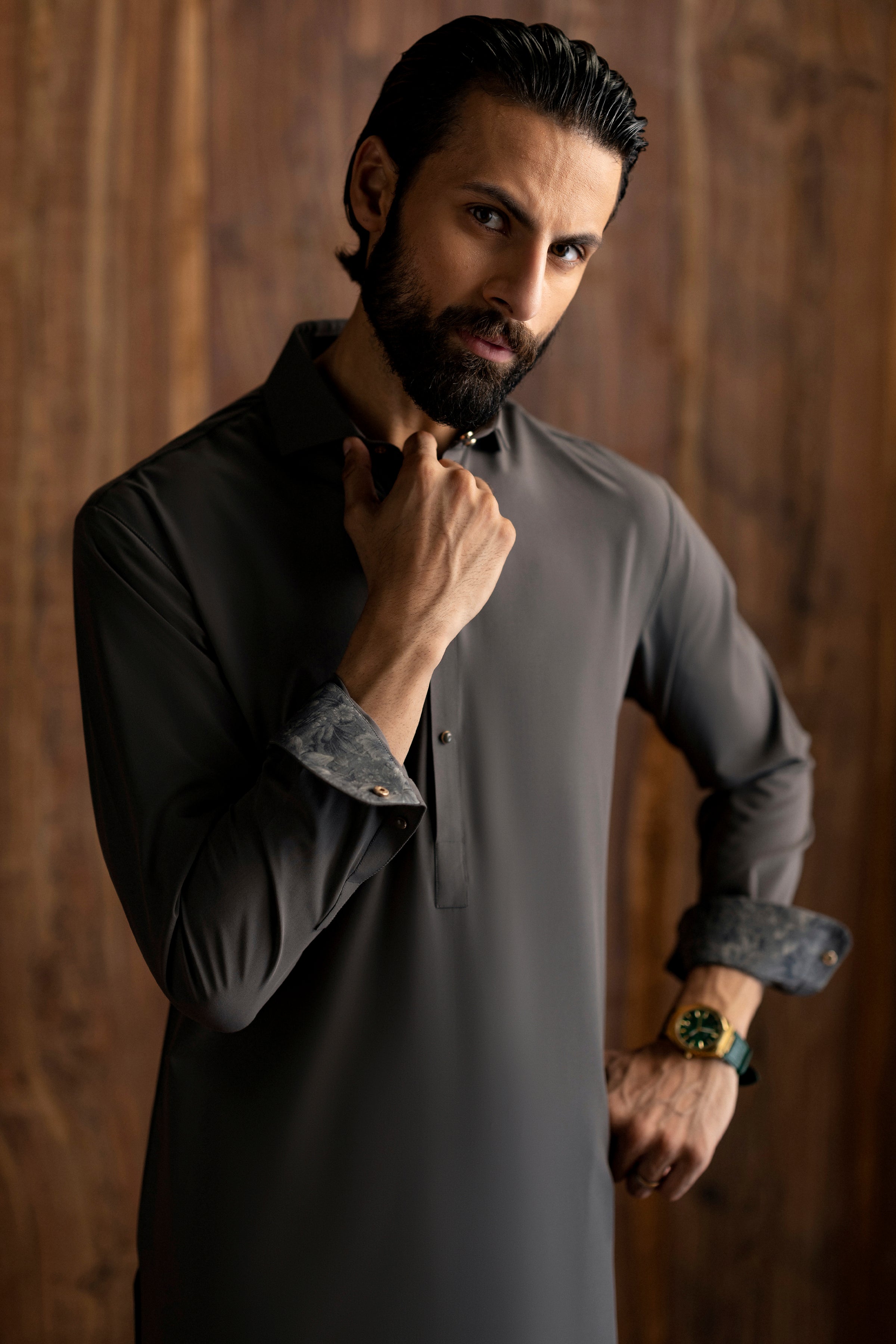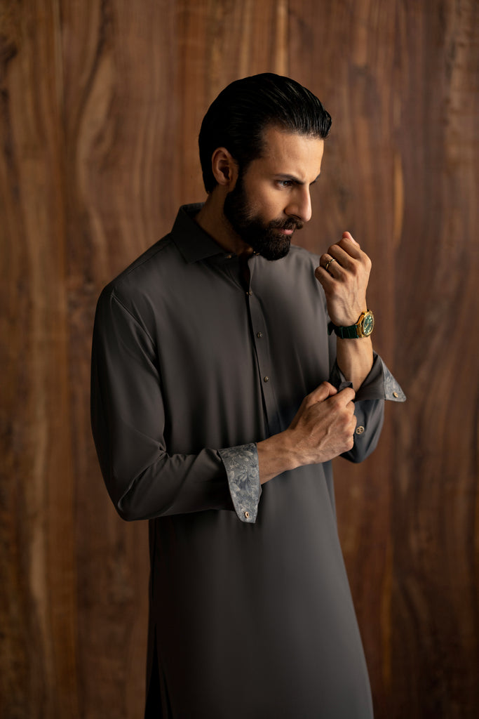 Shirt Collar With Cuffs, Embroidery at Shoulder, Armhole, Collar Back, Yoke, As Well As at Sleeve Vents and Cuffs, Square Hem.