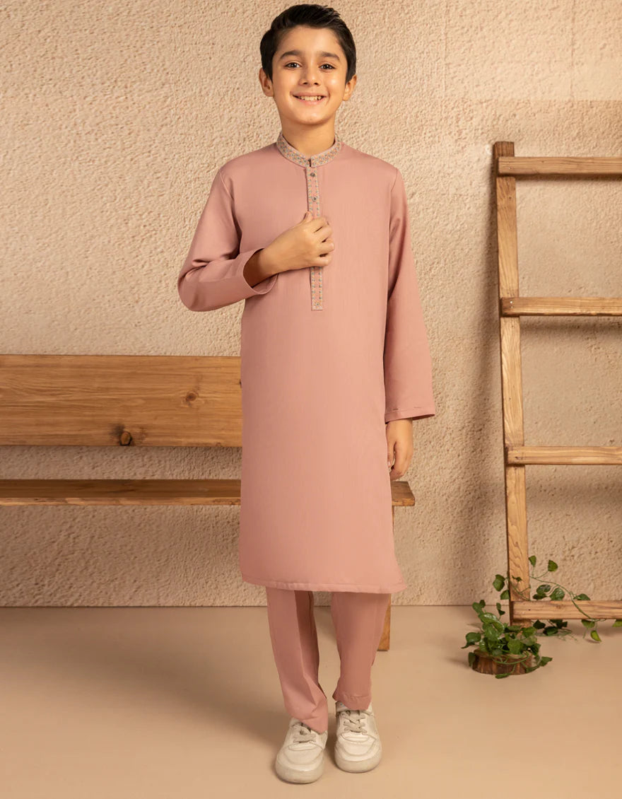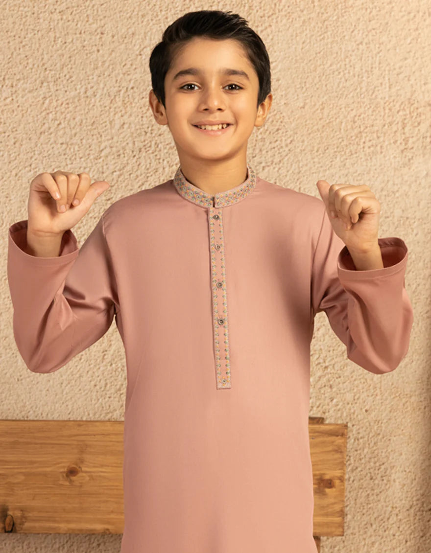 Designed with a refined touch, this tea pink blended semi-formal kurta trouser set offers a clean look that's ideal for small events, meetups, or evening wear.