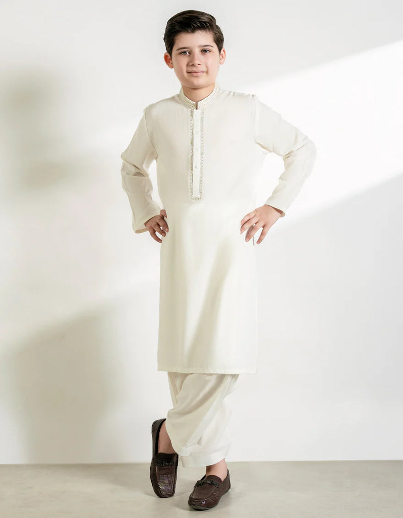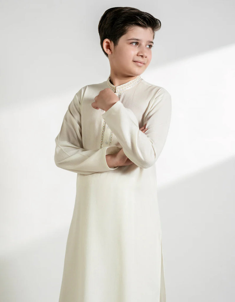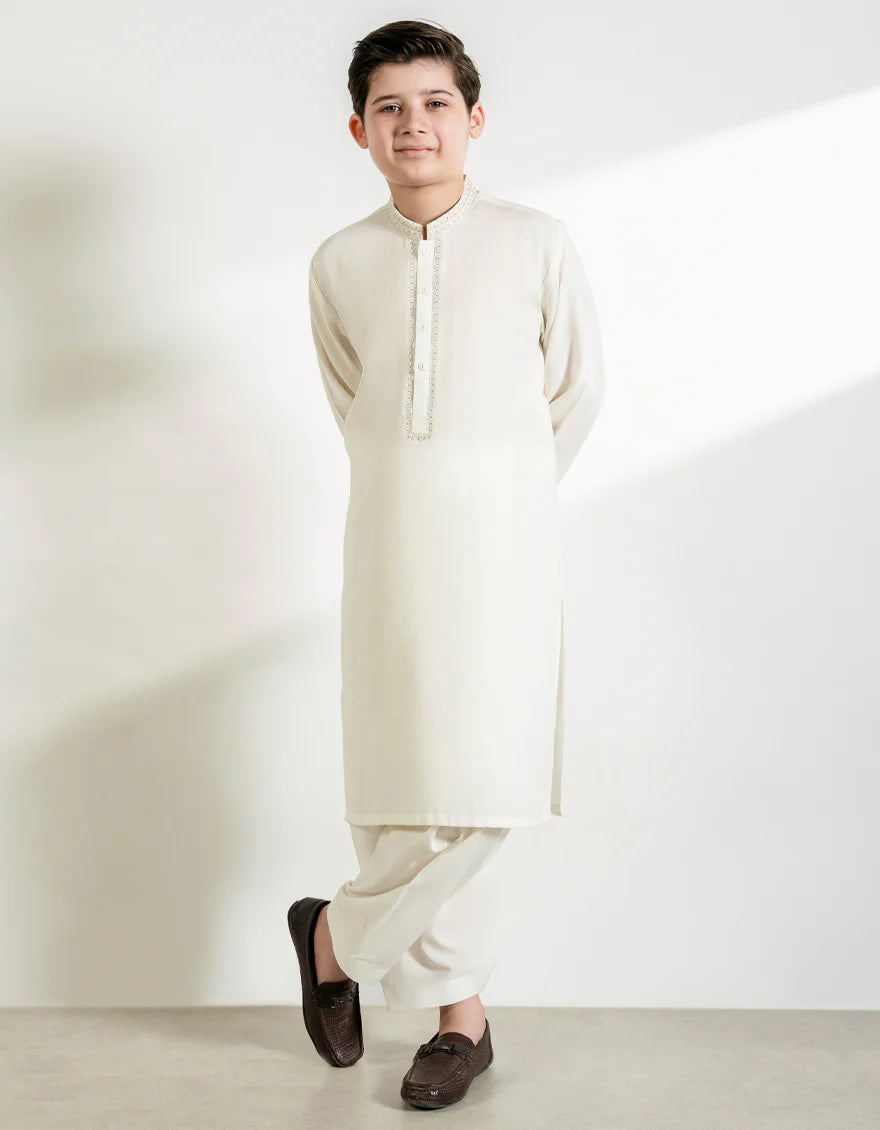 A comfortable and classic Off White Blended Kameez Shalwar made for little boys. Easy to wear and perfect for everyday use. Neat stitching and a smart look keep your child looking tidy and well-dressed.
