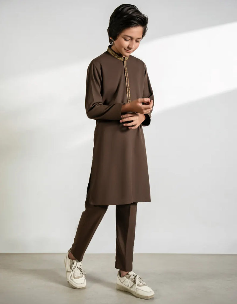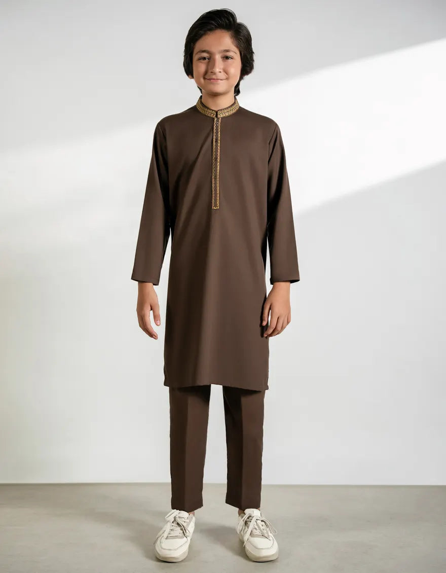 Designed for a sharper, more structured appearance, this Brown Blended Kurta Trousers set offers a modern fit with clean lines. The kurta features subtle detailing, while the straight-cut trousers ensure a neat silhouette. Perfect for events, workdays, or weekend wear.