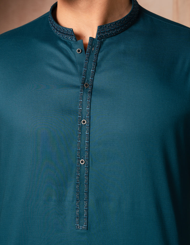 This teal cotton semi-formal kurta offers a neat, stylish look that works well for family gatherings, dinners, or casual events. Easy to wear and effortlessly smart.