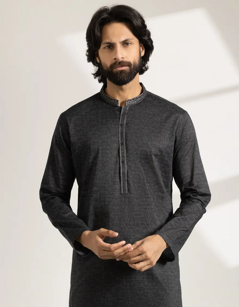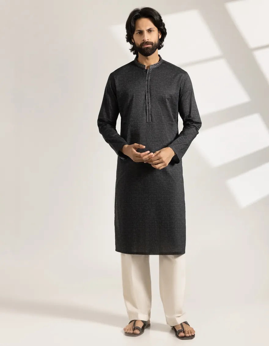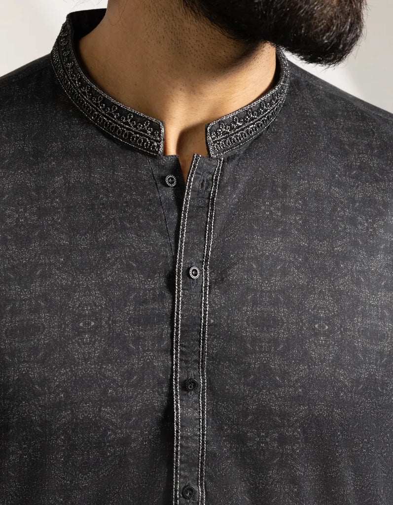 This Charcoal Cotton Printed Semi-Formal Kurta combines elegance with simplicity. Finished with detailed stitching and smart button styling, it's ideal for semi-formal occasions or casual meetups. A versatile piece that carries both ease and refinement.