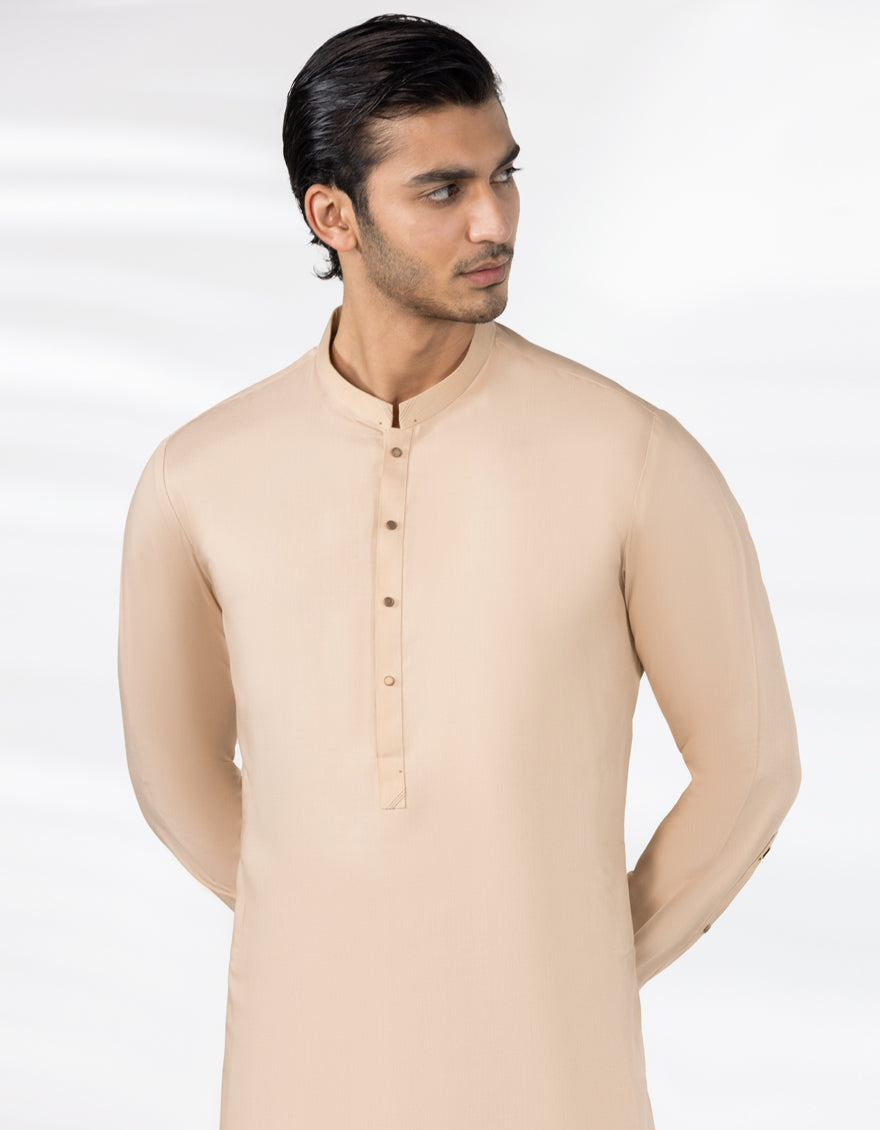 Designed for a sharper, more structured appearance, this Fawn Blended Kurta Trousers set offers a modern fit with clean lines. The kurta features subtle detailing, while the straight-cut trousers ensure a neat silhouette. Perfect for events, workdays, or weekend wear.