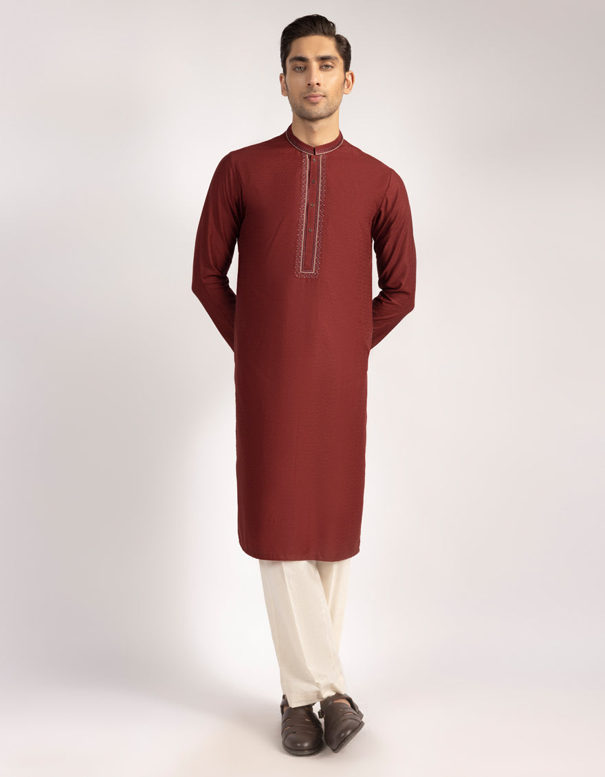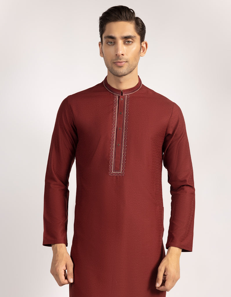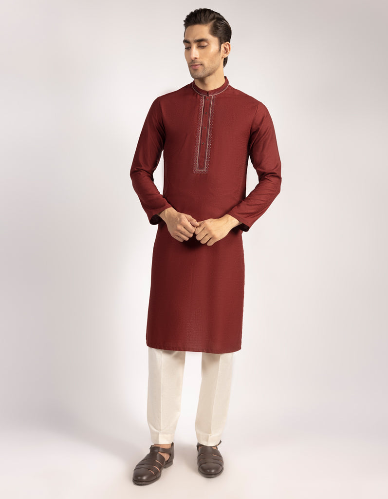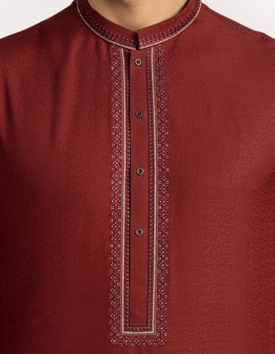 Designed for a sharper, more structured appearance, this Maroon Blended Jacquard Kurta Trousers set offers a modern fit with clean lines. The kurta features subtle detailing, while the straight-cut trousers ensure a neat silhouette. Perfect for events, workdays, or weekend wear.