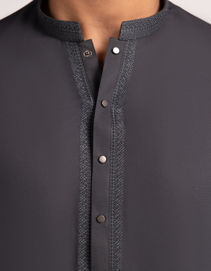 A classic eastern wear set designed with clean stitching and thoughtful detailing. The dark grey semi-formal kameez shalwar offers a neat look & comfortable fit - ideal for long wear, daily use, or special occasions with a touch of tradition.