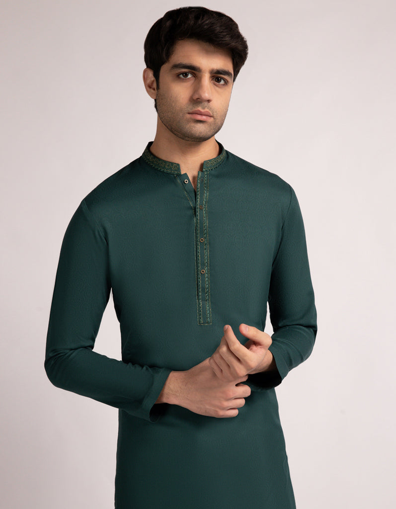 Designed for a sharper, more structured appearance, this green formal kurta trousers set offers a modern fit with clean lines. The kurta features subtle detailing, while the straight-cut trousers ensure a neat silhouette. Perfect for events, workdays, or weekend wear.