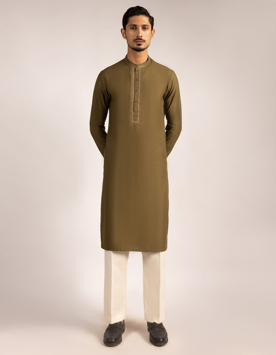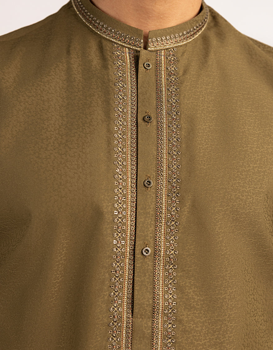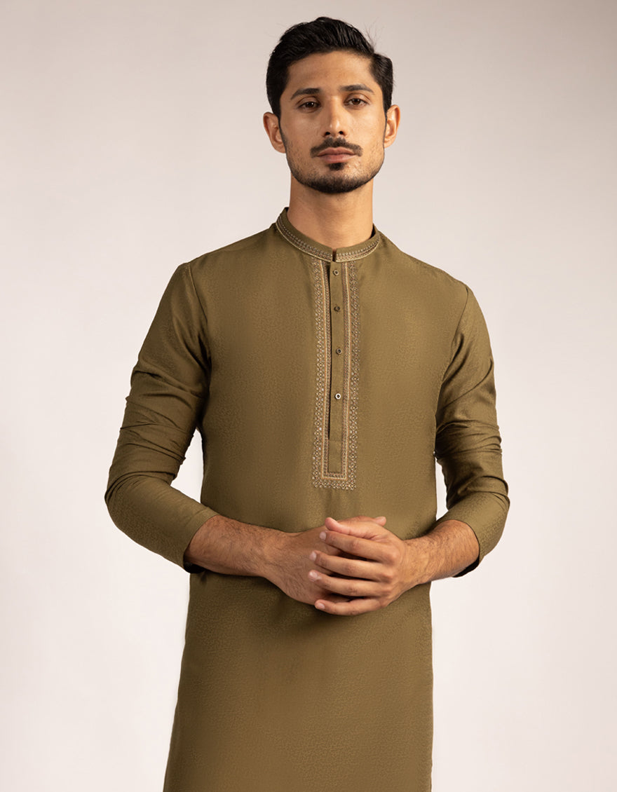 Designed for a sharper, more structured appearance, this Mehndi Green Blended Jacquard Kurta Trousers set offers a modern fit with clean lines. The kurta features subtle detailing, while the straight-cut trousers ensure a neat silhouette. Perfect for events, workdays, or weekend wear.