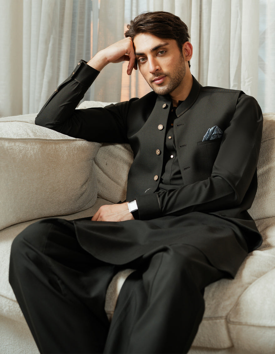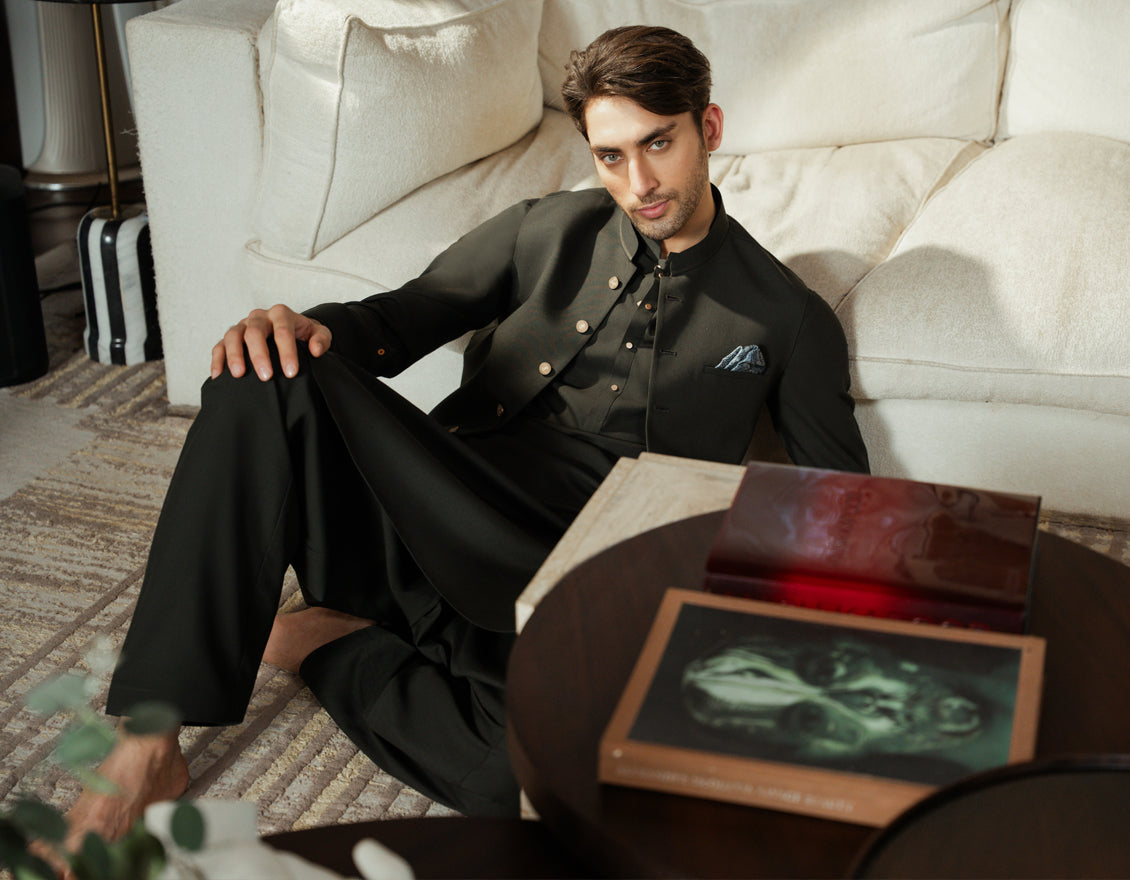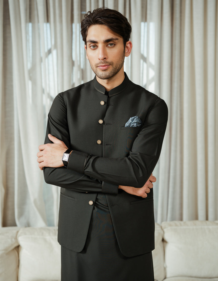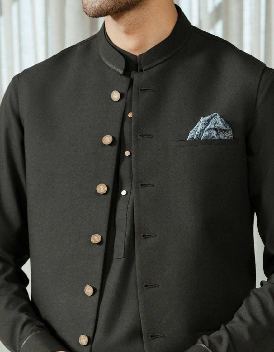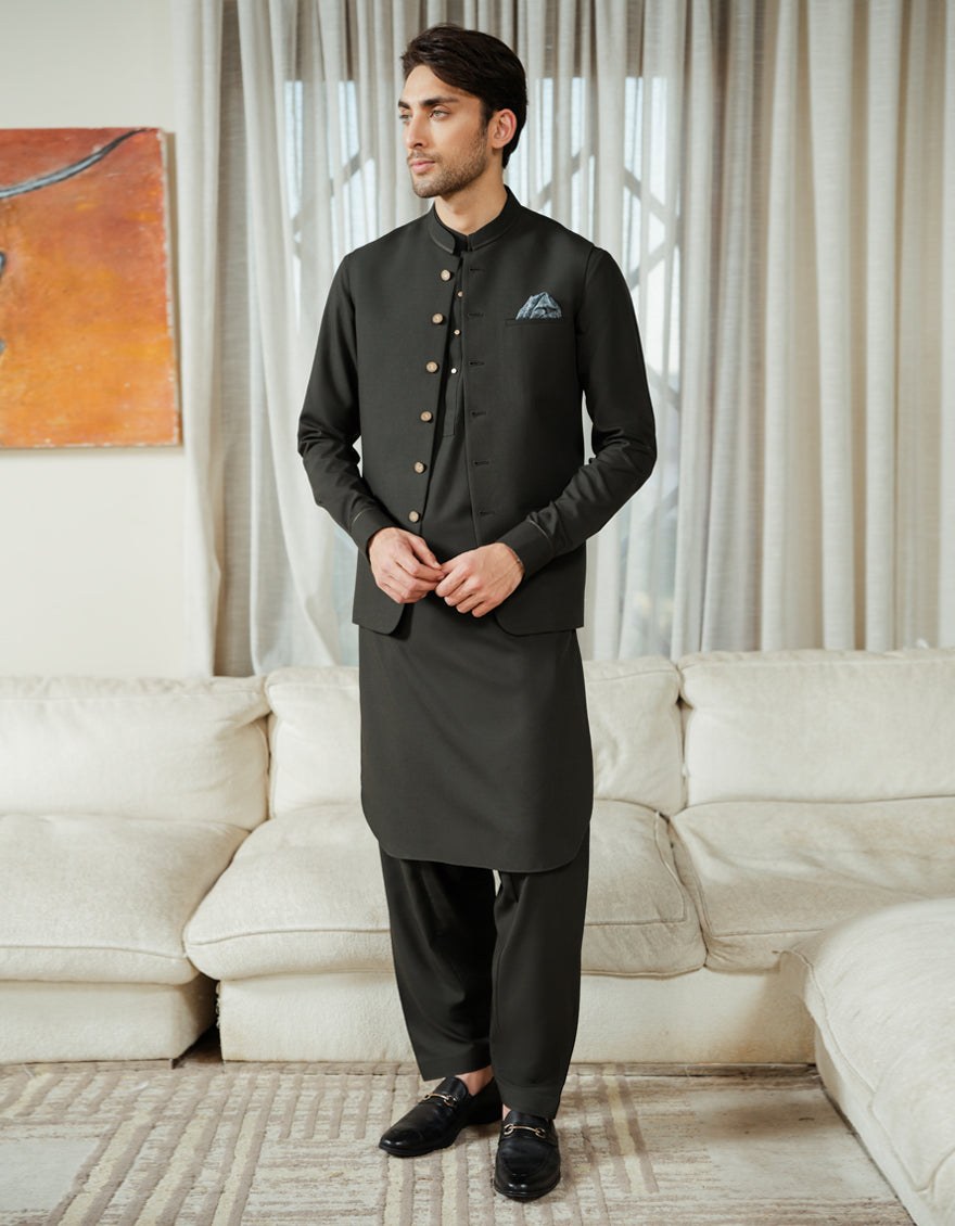 BOTTLE GREEN BLENDED KAMEEZ SHALWAR+WAISTCOAT | JJKSVC-A-48320/S26/JJ10518-EX