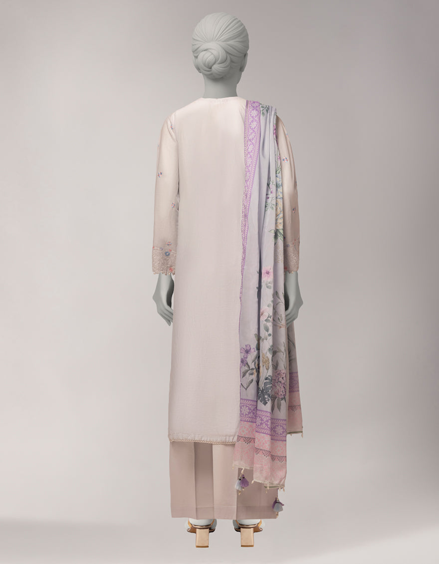 Embrace refined elegance with this three-piece stitched ensemble, designed for a luxurious everyday or festive look. The long classic kurta features a Magsi neckline with a V-cut, full sleeves adorned with intricate embroidery and handwork, and delicate tassel accents for a graceful finish. Paired with dyed straight trouser and a digitally printed silk dupatta, this set radiates sophistication and timeless charm.