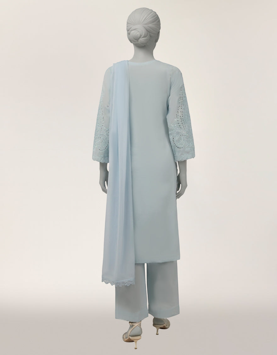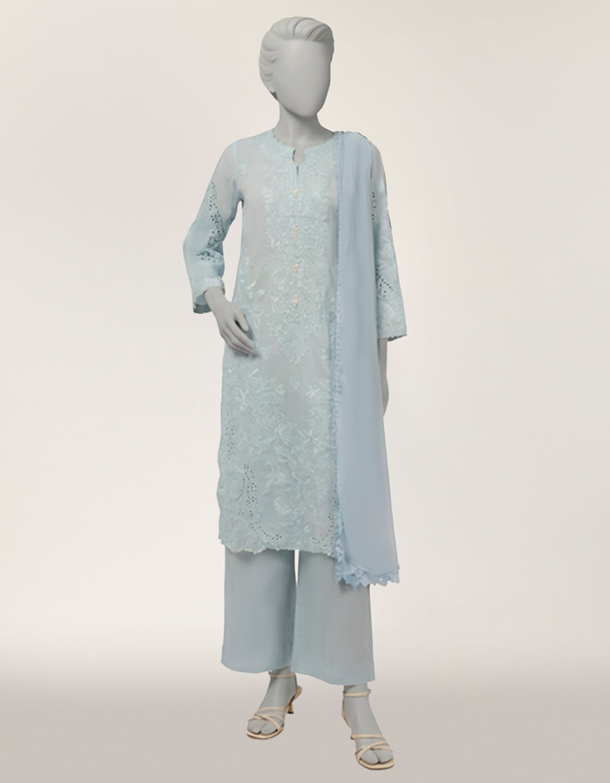 A graceful three-piece stitched lawn outfit designed for casual elegance. The long straight shirt features an embroidered front, fully embroidered sleeves, and a round neckline with keyhole detail. Paired with a dyed lawn palazzo and a lightweight bamber chiffon dupatta, this ensemble offers comfort with style.
