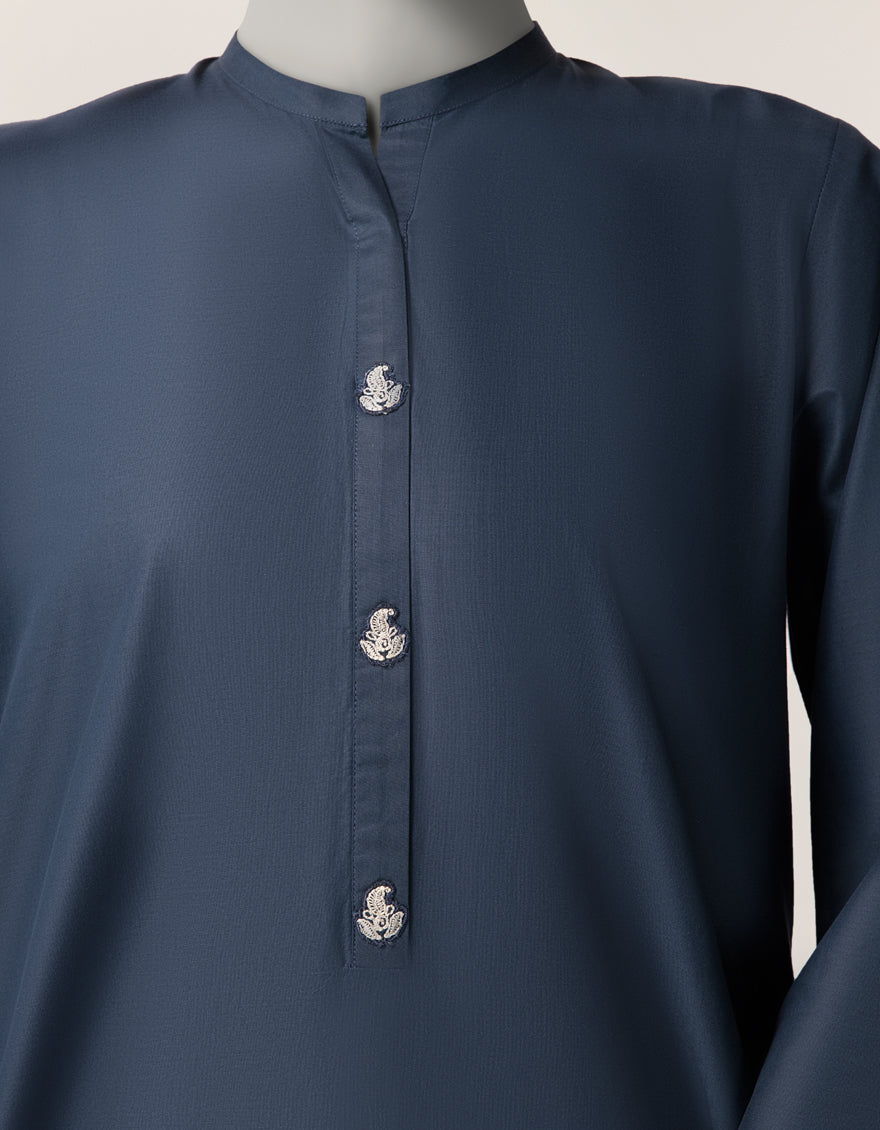 Step into refined elegance with this three-piece stitched lawn set. The long regular-fit shirt features a dyed embroidered front, embroidered sleeves, and a band collar with button patti, adorned with delicate buttons and pearls. Paired with an embroidered izaar and a basic digital printed lawn dupatta, it combines comfort with classic charm.