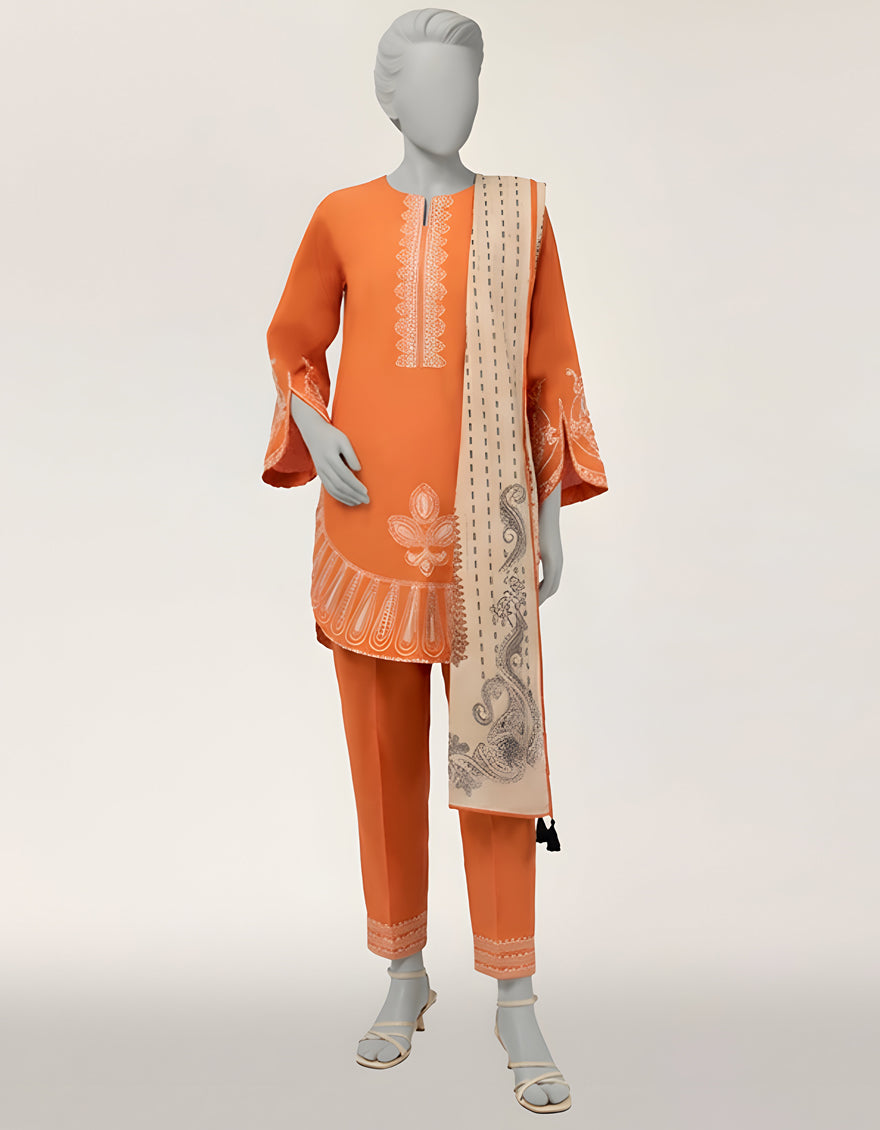 A chic three-piece stitched lawn outfit perfect for casual wear. The short classic kurta features a straight front and back with round hems, straight sleeves with slit, and a Magzi V-neckline, accented with delicate lace. Paired with a dyed lawn shalwar and a digital printed lawn dupatta, this ensemble blends style with all-day comfort.